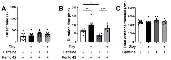 The caffeine-induced insomnia mice were used in the pentobarbital-induced sleep model to assess the potential alleviation of insomnia. Zizy extract was orally administered twice at 24 h intervals, while caffeine (10 mg/kg) or saline was treated intraperitoneally 20 min after the last extract administration. The pentobarbital was administered intraperitoneally, and measurements were taken for sleep latency and duration. ICR mice (n = 8) used in the experiment had an adaptation period of one week before the experiment. Mice were segregated randomly into four groups: pentobarbital-treated group; pentobarbital + Zizy (200 mg/kg)-treated group; pentobarbital + caffeine-treated group; and pentobarbital + Zizy (200 mg/kg) + caffeine-treated group.