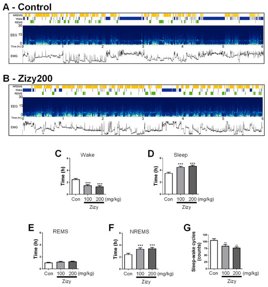 Effects of Zizy extract on sleep architecture in rats analyzed by the automatic sleep scoring algorithm. The representative instances of the AccuSleep interface, exhibiting sleep stages, EEG spectrograms, and EMG power in both the control and Zizy200, are shown (A,B). The analysis encompassed wake and sleep times (C,D), REMS and NREMS durations (E,F), as well as sleep–wake cycles (G). The sleep assessment employed the AccuSleep algorithm, programmed in MATLAB, for automated sleep scoring. For seven days, Zizy extract was orally administered at doses of 100, 200 mg/kg once daily. Following the last administration, EEG and EMG recordings were carried out, focusing on a 6 h window (10:00–16:00) for analysis. The analysis was divided into each sleep state using a 5 s epoch via an automatic sleep scoring algorithm. Data are expressed as the mean ± SEM (n = 6) and were analyzed by one-way ANOVA followed by Tukey’s post hoc test. ** p < 0.01 and *** p < 0.001 compared with the control group. Zizy, Zizyphi Semen extract; EEG, electroencephalogram; EMG, electromyogram; REMS, rapid eye movement sleep; NREMS, non-REMS; Wake, wakefulness.