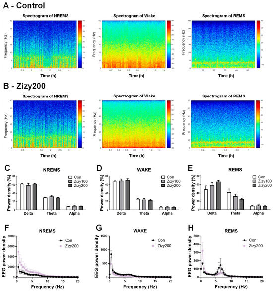 Using power spectrogram analysis, the effect of Zizy extract on the power density of distinct wavelengths was assessed. Representative time-dependent power spectral heatmaps provided a comprehensive overview of wakefulness, REMS, and NREMS states across both the control and Zizy200 groups (Figure 5A,B). Expression range adjustments were made to distinctly display the characteristics of each state. Further quantitative analysis (Figure 5C–E) indicated that Zizy extract administration for 7 days had no observable effect on the delta (δ), theta (θ), and alpha (α) power densities during NREMS and WAKE. In REMS, there appeared to be a trend towards an increased delta (δ) and a decreased theta (θ), although these changes did not reach statistical significance. The results of graphing the overall power density level in the range of 0–20 Hz including the delta, theta, and alpha also showed changing power density levels in REMS, but no significant differences were found (Figure 5F–H). These results suggest that Zizy extract did not significantly alter the power density of specific wavelengths in each sleep state.