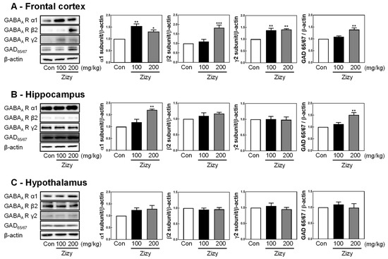 Effects of Zizy extract on the modulation of GAD65/67 and GABAA receptor subunits. Western blot analysis of (A) rat frontal cortex, (B) hippocampus, and (C) hypothalamus after EEG analysis. The presented findings represent the results from three separate experiments, with quantification data provided in the right panel. Data are expressed as the mean ± SEM (n = 3) and were analyzed by one-way ANOVA followed by Tukey’s post hoc test. * p < 0.05, ** p < 0.01, and *** p < 0.001 compared with the control group. Zizy, Zizyphi Semen extract.