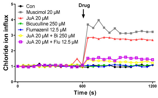 Displayed in Figure 7 is the effect of JuA, a characterizing constituent of Zizy extract, on intracellular Cl− influx in vitro using the human SH-SY5Y neuroblastoma cell line. Treatment with JuA led to a rise in intracellular chloride influx, similar to the effect seen with muscimol. The concentration of JuA used was determined through cell viability and cytotoxicity assays, referencing previous studies. Bicuculline, acting as a competitive GABAA receptor antagonist, and flumazenil, a benzodiazepine receptor antagonist, were included in this investigation. Muscimol served as a positive control, exerting itself as a potent GABAA receptor agonist. Pretreatment with the individual antagonist itself did not produce significant changes in MQAE fluorescence values. However, when flumazenil or bicuculline was applied before JuA, intracellular Cl− influx was noticeably reduced compared to when JuA was applied alone. These findings suggest that JuA stimulates Cl− influx by modulating GABAA receptors.
