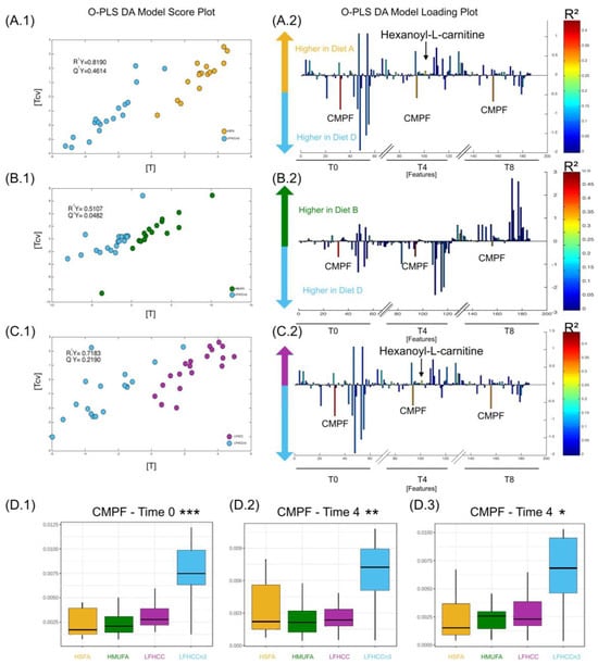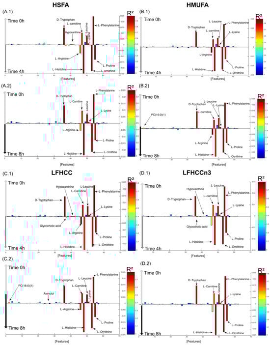 - The earliest postprandial period (time 4 h) showed higher levels of phosphatidylethanolamine (PE) (14:0), PC (16:0), hexanoyl-L-carnitine, isobutyryl-L-carnitine, creatinine, L-arginine, L-methionine, and L-ornithine. The HMUFA diet exhibited higher levels of two recognized molecules with antioxidant properties, L-valine, and 4-hydroxybenzaldehyde, during the late postprandial period (time 8 h).