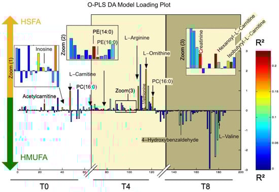 - The HSFA diet, compared to the HMUFA diet, had the strongest impact during the fasting period (time 0 h), with higher levels of metabolites associated with inflammation such as acetylcarnitine and L-carnitine. It also showed higher levels of inosine and phosphatidylcholine (PC) (16:0).