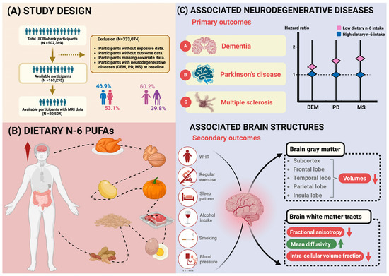 The following supporting information can be downloaded at: https://www.mdpi.com/article/10.3390/nu16244272/s1, Table S1: definitions of neurodegenerative diseases; Table S2: definitions of imaging phenotypes of brain gray matter; Table S3: definitions of covariates; Table S4: single-nucleotide polymorphisms used to build the genetic risk score for DEM; Table S5: single-nucleotide polymorphisms used to build the genetic risk score for PD; Table S6: single-nucleotide polymorphisms used to build the genetic risk score for MS; Table S7: incidence rates of neurodegenerative diseases by sex; Table S8: associations of dietary n-3 PUFA intake and neurodegenerative diseases; Table S9: descriptive analysis of brain phenotypes; Table S10: associations of dietary n-6 PUFA intake with phenotypes of gray matter by sex; Table S11: associations of dietary n-6 PUFA intake with phenotypes of white matter by sex; Table S12: associations of dietary n-6 PUFA intake with the phenotypes of brain gray matter; Table S13: associations of dietary n-6 PUFA intake with the phenotypes of brain white matter; Table S14: sensitivity analysis of the main associations.