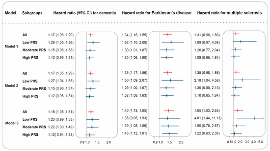 Associations between dietary n-6 PUFA intake and neurodegenerative diseases by genetic risks. A total of 169,295 participants were included to evaluate the relationship between low dietary n-6 PUFA intake and the incidence of dementia, Parkinson’s disease, and multiple sclerosis using the Cox proportional hazards regression model. Subgroup analyses were categorized into four groups: the overall population, low polygenic risk score (PRS), moderate PRS, and high PRS. Results for the overall population were presented in red, and those for the other subgroups were displayed in blue. Model 1 adjusted baseline characteristics including age, sex, and IMD. Model 2 further adjusted WHR and healthy lifestyle factors. Model 3 added adjustments for blood pressure, metabolic biomarkers, dietary n-3 PUFA intake and dietary n-3/n-6 PUFA intake ratio. Results were presented as HRs ± 95% CIs.