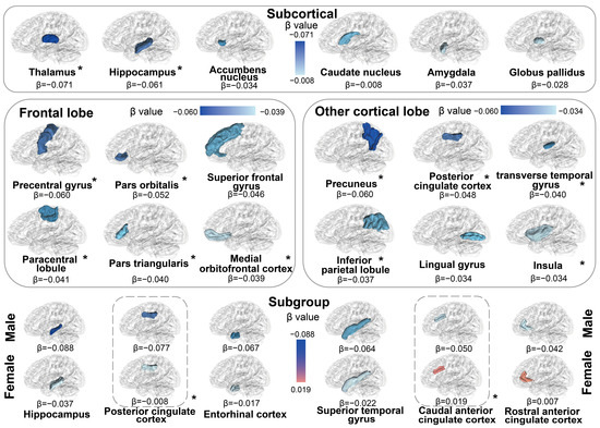 Associations between dietary n-6 PUFA intake and the volume of brain gray matter. The relationships between dietary n-6 PUFA intake and the volumes of the brain subcortex and cortex were assessed using multiple linear regression models among 20,506 participants with available MRI data from the UK Biobank. Results are presented as β values, with significance determined by p values. Furthermore, the results of stratified analyses by sex are presented at the bottom. Regions marked in red denote positive correlations, while those in blue denote negative correlations. The color from light to dark indicates that the absolute value of the effect value changes from small to large. The brain structure is in bold font and with an asterisk which indicates the association of statistical significance.