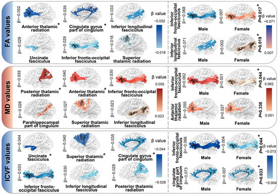 Associations between dietary n-6 PUFA intake and brain white matter integrity. The relationships between dietary n-6 PUFA intake and the integrity of white matter tracts were evaluated using multiple linear regression models among 20,504 participants with available MRI data from the UK Biobank. The fractional anisotropy (FA), mean diffusivity (MD), and intra-cellular volume fraction (ICVF) of white matter tracts were utilized as reference metrics. Results are presented as β values, with significance determined by p values. Furthermore, the results of stratified analyses by sex are presented on the right. Regions marked in red denote positive correlations, while those in blue denote negative correlations. The color from light to dark indicates that the absolute value of the effect value changes from small to large. The brain structure is in bold font and with an asterisk which indicates the association of statistical significance.