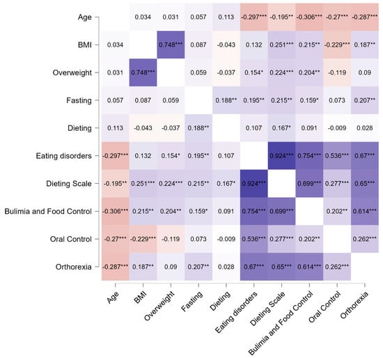 Spearman’s rho heatmap. BMI—body mass index. * p < 0.05, ** p < 0.01, *** p < 0.001.