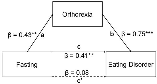 Path plot for the indirect effect of fasting on eating disorder via orthorexia. Path a—effect of fasting on orthorexia; path b—effect of orthorexia on eating disorder; path c—total effect of fasting on eating disorder; path c′—direct effect of fasting on eating disorders in the absence of orthorexia. ** p < 0.01, *** p < 0.001.