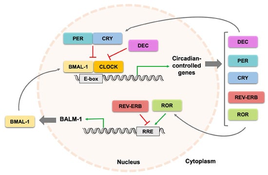 The second autoregulatory feedback loop derives from the CLOCK-BMAL-1-induced expression of the transcription promoters retinoic acid-related orphan nuclear receptors (ROR-α, -β, -γ) and the transcription repressors REV-ERB-α, -β. RORs and REV-ERBs compete to bind retinoic acid-related orphan receptor response elements (ROREs) present in the Bmal1 promoter, modulating BMAL-1 expression [24].