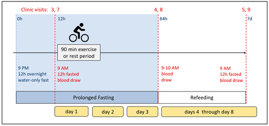 | 7 | Start of fasting and cycling exercise/rest period | 3.5 h | Fasting starts a night before | |