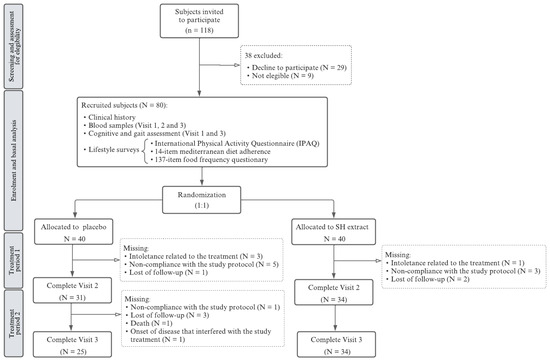 A total of 118 individuals were initially assessed for eligibility, with 80 ultimately included and randomly assigned to either the experimental group receiving the SH extract (n = 40) or the control group receiving a placebo (n = 40). Among the 38 individuals who were excluded, 29 declined to participate and 9 did not meet the inclusion/exclusion criteria. Of the 80 participants, 65 completed the 6-month follow-up (visit 2), and 59 completed the full 11-month study period (visit 3). A total of 21 participants withdrew from the study: 15 from the placebo group and 6 from the SH extract group. Reasons for withdrawal included treatment intolerance (4 participants: 3 from the placebo group, 1 from the SH treatment group), noncompliance with the study protocol (9 participants: 6 from the placebo group, 3 from the SH treatment group), loss to follow-up (6 participants: 4 from the placebo group, 2 from the SH group), one death (placebo group), and the development of a medical condition deemed by the investigator to interfere with study participation (1 participant, placebo group) (Figure 1).