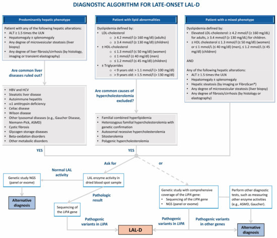 Three biochemical phenotypes can be distinguished: that characterized by hepatic impairment, that dominated by dyslipidemia, and the mixed phenotype. Patients do not always present hepatic and lipid alterations, as neither may appear at onset but rather become apparent as the disease progresses. In some instances, LAL-D can mimic pure dyslipidemias, such as heterozygous familial hypercholesterolemia and familial combined hyperlipidemia. LAL-D should be ruled out in patients with suspected heterozygous familial hypercholesterolemia not confirmed by genetic testing, particularly in those not responding adequately to statins [24,25,26].