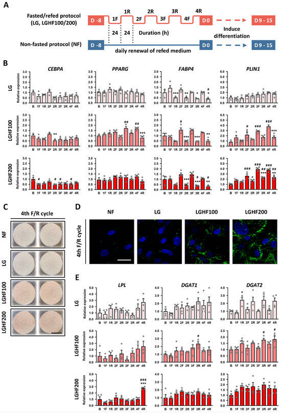 This alternating “fasting/refeeding” (F/R) treatment elicited cyclic expression of the adipogenic marker genes FABP4, an intracellular lipid-binding and transport protein, and PLIN1, a lipid droplet-binding regulator of lipolysis. FABP4 and PLIN1 tended to be induced, or were significantly upregulated, under fasting conditions, especially with LGHF100/200 (Figure 1B).