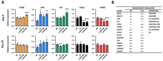 To assess whether repeated F/R cycles affected the ASC adipogenic potential, we differentiated ASCs subjected to four F/R-cycles (8 days total) with or without OA and compared these with “non-cycled” ASCs cultured in standard medium (HGLF) for 8 days prior to differentiation (NF, non-fasted). Cells were examined on day 9 and day 15 of differentiation. Quantitative PCR showed that the cells exposed to OA during the F/R cycles (LGHF200) had a significant increase in the expression of LPL, LIPE, and CD36 on day 9 (Figure 2A), all involved in FFA pathways in the cell and known to be upregulated by fasting and low insulin [56]. At the same time, LGHF cells showed a lower expression of CXCL1 and TGFB1 compared to NF and LG cells (Figure 2A). These represented about one-third of all genes assessed by RT-qPCR (Supplementary Figure S1). Of note, effects on gene expression seen on day 9 were lost by day 15 (Figure 2A,B). Together, these results suggest that cyclic changes in nutrient availability associated with intermittent fasting can affect gene expression in differentiating adipocytes in the medium term. However, these changes are reversed in the long term as the cells progress to a more mature adipogenic state.