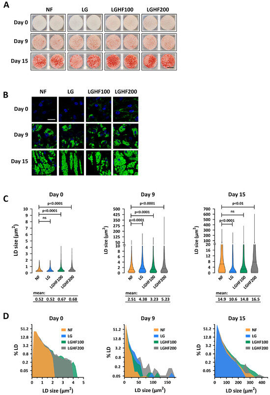 Since we observed a difference in intracellular neutral lipid content in ASCs after four F/R cycles (see Figure 1C,D and Figure 3C,D), we asked whether this difference would persist or increase during differentiation. We observed different lipid droplet (LD) dynamics depending on whether the cells had been fasted with LG or LGHF100/200 (Figure 3A,B). While the F/R cells on average had a larger mean size of LDs than the non-cycled cells on day 9 of differentiation (Figure 3C; 3.23–5.23 vs. 2.51 μm2), only the LGHF200 cells still showed augmented LD size on day 15 (16.5 vs. 14.9 μm2) (Figure 3C). The LDs in the LGHF100 cells were now comparable with non-cycled cells, while the LG cells displayed LDs that on average were smaller than in the NF group (10.6 vs. 14.9 μm2; Figure 3C). The increase in the average LD size for the LGHF200-cycled cells on day 15 indicated that these cells were affected, at least metabolically, by events more than 2 weeks earlier, despite gene expression levels being back to normal (see Figure 2A). Notably, only a minor fraction (Day 0: ~9.5%; Day 9: ~8%; Day 15: ~1.5%) of the LDs were larger in LGHF200 cells when compared to NF cells by calculating ΔAUC (Figure 3D). Still, this indicates that a subset of the cells and/or LDs had reached a threshold that triggered semi-permanent changes.