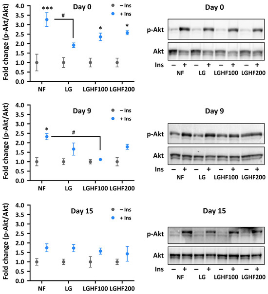 Adipocyte size and lipid droplet morphology correlate with systemic insulin sensitivity [57,58] and adipocytes’ ability to respond adequately to insulin [59,60]. Using the phospho-Ser473 Akt to total Akt ratio (p-Akt/Akt) as a proxy for insulin sensitivity, we found the non-cycled ASCs to be the most insulin-sensitive on day 0, followed by LGHF100/200 and LG-fasted cells (Figure 4). On day 9, and even more so on day 15, the differences between the F/R regimens were reduced (Figure 4).