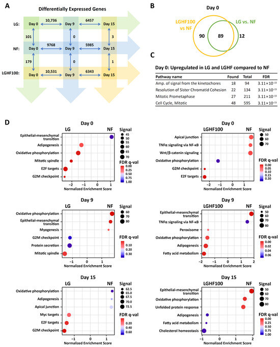 F/R cycling-dependent activation of functional pathways are lost by day 15 of differentiation. Total RNA sequencing was performed on ASCs at baseline (Day 0; n = 5, 3 donors), following either four F/R cycles or 8 days in standard culture medium, and after consecutive induction of differentiation on Day 9 and Day 15 under the same prior conditions (n = 3, 1 donor). (A) Differentially expressed genes (DEGs) between time points and pre-treatments in differentiating ASCs (FDR-adjusted p-value < 0.05). (B) Venn diagram of DEGs in LG- and LGHF100-cycled compared to NF cells on day 0. (C) The intersecting DEGs from (B) were tested for overrepresentation against the Reactome gene sets. (D) Gene set enrichment analysis (GSEA) with the MSigDB Hallmark gene set. NF: non-fasted; LG: low glucose; LGHF100: low glucose/high fatty acid (100 μM oleic acid).