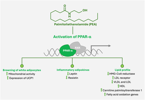 PEA modulates several physiological processes, including cellular metabolism, inflammation, immune responses, neuroprotection, and pain perception. PEA exerts its effects through multiple mechanisms. The primary mechanism involves the activation of PPAR-α, a nuclear receptor that regulates gene expression in lipid metabolism, inflammation, and energy homeostasis and is considered a target for metabolic syndrome. After ligand binding, PPAR-α heterodimerizes with its obligate partner, the retinoic acid X receptor (RXR). This complex then binds to peroxisome proliferator response elements (PPREs), specific DNA sequences located in the promoter regions of target genes [42]. PPAR-α activation induces lipid uptake and catabolism (fatty acid oxidation, in particular, β-oxidation) and the production of apolipoproteins A-I and A-II, thereby diminishing circulating triglyceride and LDL cholesterol and increasing the HDL cholesterol levels. These effects on lipid metabolism are particularly relevant in conditions characterized by dyslipidemia, such as metabolic syndrome. In addition to their anti-dyslipidemic activities, recent in vitro and preclinical data indicate that PPAR-α agonists also have direct vasoprotective effects [43].