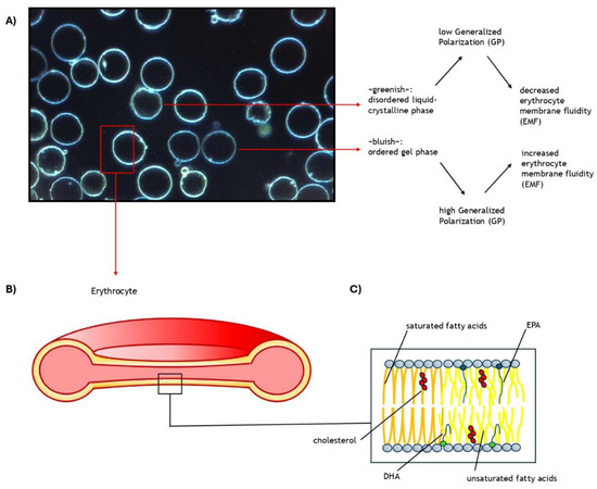 This figure is a comprehensive illustration of the latest evidence on erythrocyte membrane fluidity: (A) This image was obtained through confocal microscopy after staining a blood sample with a specific probe (Laurdan). This probe is characterized by a shift in the emission spectrum reflecting the lipid phase state of the environment (bluish in ordered gel phases and greenish in disordered liquid–crystalline phases). After staining, five images of Laurdan emission intensity were acquired concurrently in two distinct channels (emission filter: 450/50 nm for the blue channel, 525/50 nm for the green channel) using a 60× immersion-oil objective. Generalized polarization (GP) was calculated as follows: GP = Iblue − G Igreen/Iblue + G Igreen, where Iblue and Igreen are the intensities for the blue and green channels, respectively, and G is a calibration factor that depends on the experimental setup. GP is a measure of membrane fluidity. (B) Longitudinal section of an erythrocyte. (C) Description of the main components of the erythrocyte membrane.