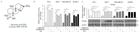 KA-induced enhancement in PPARγ activity of kaurenoic acid (KA). (A) The chemical structure of KA. (B,C) Luciferase activity corresponding to the PPAR response element reporter gene. The mRNA and protein levels in 3T3-L1, MCF-7, MDA-MB-231, and SK-BR-3 cells treated with 100 µM KA, 10 µM ciglitazone, or 20 µM rosiglitazone. *, p < 0.05.