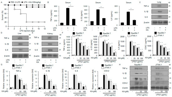 The impact of KA on the mRNA and protein levels of inflammatory cytokines in LPS-treated macrophages. (A) C57BL/6 mice were administered with LPS (20 mg/kg) via i.p. injection. The treatment group received KA (100 mg/kg) via i.p. injection. The survival rate of all groups (n = 10) was analyzed daily for 12 days following LPS injection. (B–E) The protein levels of IL-1β, IL-6, and TNF-α in the serum, lungs, liver, and kidneys of the treated mice, as assessed by ELISA and Western blot. (F–H) The mRNA and protein levels of IL-1β, IL-6, and TNF-α in LPS (1 µg/mL)-treated Raw264.7 and J774.1 cells in the presence or absence of KA (0, 25, 50, and 100 µM; 24 h), as assessed by ELISA, Western blot, and qRT-PCR. β-actin was used to normalize the relative mRNA and protein levels. *, p < 0.05. All experiments were conducted three times.