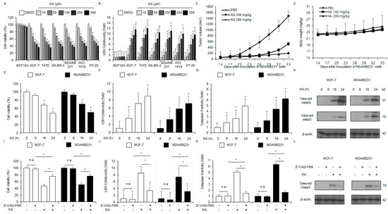 The in vitro and in vivo anticancer effects of KA. (A,B) LDH and WST-1 assays were conducted for cells (MCF-10A, HT-20, SK-BR-3, T-47D, HCC1419, MDA-MB-231, and MCF-7) treated with varying doses of KA (0, 10, 50, 100, 200, and 300 µM; 24 h). (C,D) The MDA-MB-231 tumor model was established by injecting 1 × 107 cells into the right dorsal flank of nude mice (n = 10 per group). KA (100 and 200 mg/kg) was administered (i.p. injection) twice weekly. The body weights of the treated mice were measured twice weekly. (E–H) MDA-MB-231 and MCF-7 cells were treated with KA for varying durations (0, 8, 16, and 24 h; 100 µM) and subjected to caspase-3, LDH cytotoxicity, and WST-1 assays. Western blot analysis of cleaved caspase-9 and -3 was also conducted following KA treatment for the indicated durations; *, p < 0.05. β-actin was used as the loading control. (I–L) MCF-7 and MDA-MB-231 cells were pretreated with Z-VAD-FMK (50 μM) for 4 h before KA treatment (100 µM, 24 h). Caspase-3 activity, LDH cytotoxicity, and WST-1 assays were conducted; *, p < 0.05. n.s, no significance. Western blot analysis was performed to assess the level of cleaved caspase-3. β-actin was used as the loading control.