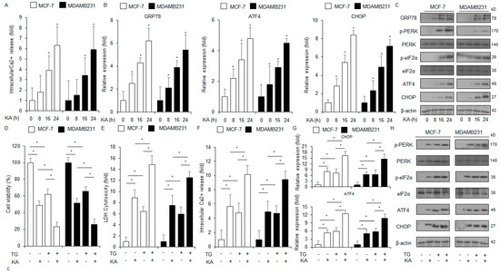 KA promotes the production of intracellular Ca2+ and apoptosis. (A) MCF-7 and MDA-MB-231 cells were treated with KA for varying durations (0, 8, 16, and 24 h; 100 µM) and subjected to intracellular Ca2+ assay; *, p < 0.05. (B) The mRNA levels of CHOP, ATF4, and GRP78 were assessed by qRT-PCR. β-actin was used as the loading control. (C) MDA-MB-231 and MCF-7 cells were treated with KA for varying durations (0, 8, 16, and 24 h; 100 µM). Western blot analysis was conducted for the proteins associated with the ER stress signaling pathway: CHOP, ATF4, GRP78, p-eIF2α, and p-PERK. β-actin was used as the loading control. (D–F) MCF-7 and MDA-MB-231 cells were treated with 3 μM TG and 100 µM KA for 24 h. LDH cytotoxicity, intracellular Ca2+, and cell viability assays were conducted; *, p < 0.05. (G,H) The mRNA levels of CHOP and ATF4 were assessed by qRT-PCR. Western blot analysis was conducted to examine the protein levels of p-eIF2α, p-PERK, CHOP, and ATF4 in MDA-MB-231 and MCF-7 cells treated with 100 µM KA and 3 µM TG for 24 h. β-actin was used as the loading control.