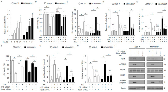We next assessed the impact of KA treatment on intracellular ROS production. KA treatment enhanced the level of ROS release in breast cancer cells over varying treatment times (Figure 6A). Next, MDA-MB-231 and MCF-7 cells were treated with ROS inhibitors (DPI or NAC) in the presence of KA. This co-treatment KA-induced enhancements in cytotoxicity, intracellular ROS generation, and caspase-3 activity (Figure 6B–E). Next, the cells were transfected with a NOX4-specific siRNA and treated with KA. NOX4 silencing reduced the increases in intracellular ROS and cytotoxicity induced by KA treatment (Figure 6F–H). Western blot analysis indicated that NOX4 silencing also inhibited the enhancements in the levels of CHOP, cleaved caspase-3, p-PERK, and NOX4 (Figure 6I). These findings indicated that NOX4 contributes to KA-induced intracellular ROS release and apoptosis in breast cancer cells.