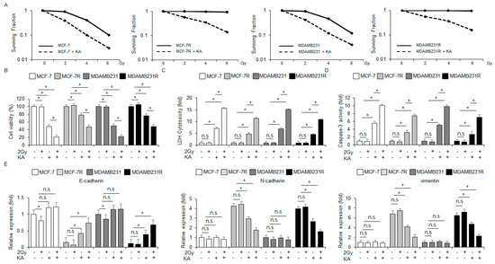 Radiation combined with KA overcomes radioresistance in breast cancer cells. (A) Colony formation analysis was performed for MDA-MB-231, MCF-7, MDA-MB-231R, and MCF-7R cells following radiation at varying intensities (0, 2, 4, and 6 Gy) and/or KA treatment. The cell survival rate was quantified; *, p < 0.05. (B–D) MDA-MB-231, MCF-7, MDA-MB-231R, and MCF-7R cells treated with 100 µM KA and 2 Gy radiation for 24 h were subjected to caspase-3 activity, WST-1, and LDH cytotoxicity assays; *, p < 0.05. n.s, no significance. (E) The mRNA levels of vimentin, N-cadherin, and E-cadherin were assessed by qRT-PCR in MDA-MB-231, MCF-7, MDA-MB-231R, and MCF-7R cells treated with 100 µM KA and 2 Gy radiation for 24 h; *, p < 0.05. n.s, no significance. β-actin was used the loading control.