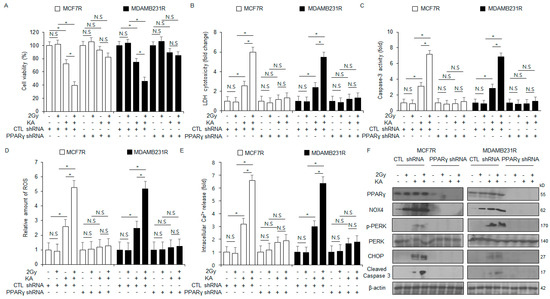 PPARγ silencing inhibits KA + radiation-induced apoptosis in MDA-MB-231R and MCF-7R cells. (A–F) MDA-MB-231R and MCF-7R cells were treated with PPARγ shRNA particles for gene knockdown. These cells were treated with 100 µM KA and 2 Gy radiation for 24 h and subjected to LDH cytotoxicity, intracellular Ca2+ and ROS, caspase-3 activity, and WST-1 assays. Western blot analysis was conducted to examine the protein levels of cleaved caspase-3, PERK, CHOP, PPARγ, NOX4, and p-PERK; * p < 0.05. N.S, no significance. β-actin was used as the loading control.