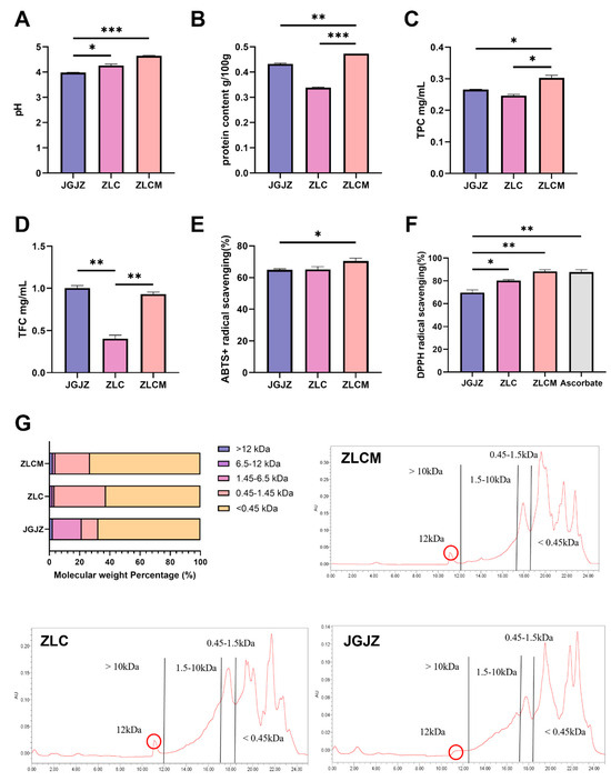The ZLC and ZLCM samples had much higher pH values than the JGJZ sample (p < 0.05 and p < 0.001, respectively) (Figure 2A,B). The protein content of the ZLCM sample was considerably higher than that of the JGJZ and ZLC samples (p < 0.01 and p < 0.001, respectively). As revealed in the HPLC chromatograms (Figure 2G), the low MW content (MW < 1.45 kDa) in the ZLC and ZLCM samples was higher than that in the JGJZ sample. Moreover, the MW content above 12 kDa and below 0.45 kDa in the ZLCM sample was higher than in the ZLC sample.