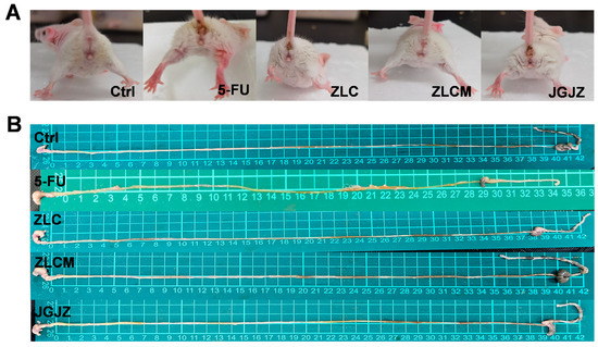 Clinical index of mice. (A) The contamination of the hair around the anus and buttocks; (B) The length of the small intestine. Ctrl: the control group; 5-FU: the model group; ZLC: pretreatment with ZLC; ZLCM: pretreatment with ZLCM; JGJZ: the positive control (pretreatment with JGJZ).