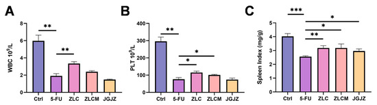 Immune organs are essential for activating the immune system and regulating immune activity [31]. To a certain degree, the spleen indexes could represent an animal’s immune function. As shown in Figure 4C, spleen index was significantly lower in the 5-FU group than in the Ctrl group (p < 0.0001). In the ZLCM, ZLC, and JGJZ groups, the spleen indexes were considerably elevated, particularly in the ZLC group (p < 0.01). However, no notable variations were seen between the samples. In addition, the human bone marrow is a hematopoietic organ and the fundamental immunological organ of humans, as well as the only source of blood cells [32]. In this study, WBC (p < 0.01) and PLT (p < 0.05, p < 0.05) counts dramatically dropped in the 5-FU group (Figure 4A,B). Nevertheless, CFBs could considerably raise the number of WBCs and PLTs after treatment with 5-FU. To sum up, these findings show that CFBs could reduce the bone marrow suppression and immunosuppression brought on by 5-FU (p < 0.01, p < 0.05), and it had better effects than JGJZ.