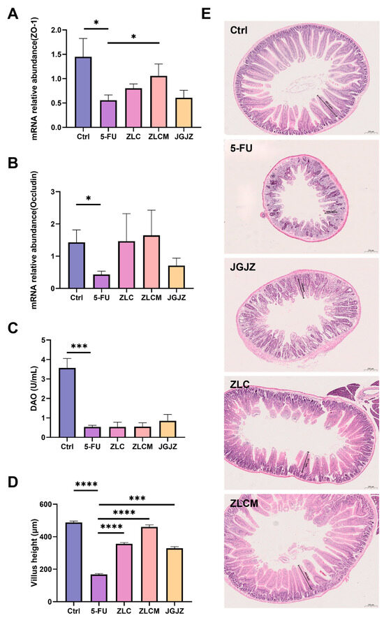 CFB ameliorated 5-FU-induced intestinal barrier injury and histopathological changes. Ctrl: the control group; 5-FU: the model group; ZLC: pretreatment with ZLC; ZLCM: pretreatment with ZLCM; JGJZ: the positive control (pretreatment with JGJZ). The mRNA expression levels of (A) ZO-1; (B) occludin; (C) DAO; (D) morphometric analysis of villus height; (E) histopathological sections of stained mucosal (5× objective, scale bar = 200 μm). Data are presented as mean ± SEM, and differences were regarded as statistically significant at a p-value < 0.05 (* p < 0.05, *** p < 0.001, or **** p < 0.0001).
