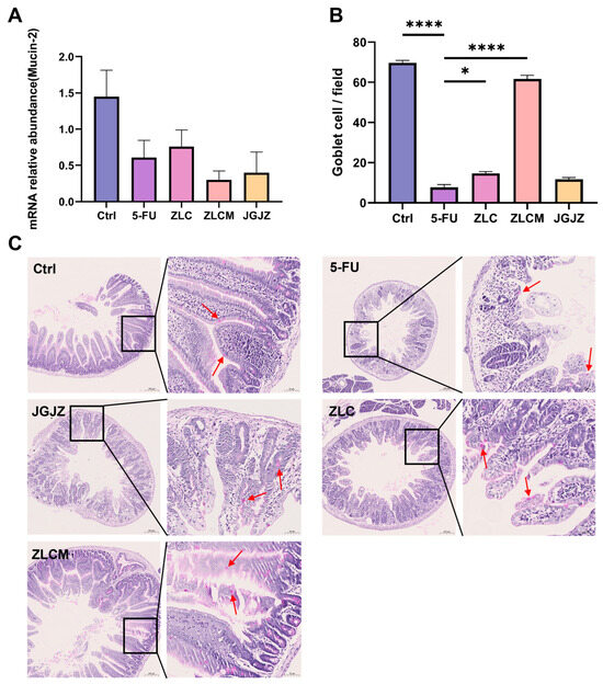 Effects of CFBs on the integrity of intestinal mucosal barrier in mice. Ctrl: the control group; 5-FU: the model group; ZLC: pretreatment with ZLC; ZLCM: pretreatment with ZLCM; JGJZ: the positive control (pretreatment with JGJZ). (A) The mRNA expression levels of Mucin-2; (B) number of goblet cells/field for experimental groups; (C) Alcian blue-periodic acid Schiff (AB-PAS) staining of ileum; the purple-magenta particles indicated by the arrow are goblet cells (20× objective, scale bar = 50 μm). Data are presented as mean ± SEM, and differences were regarded as statistically significant at a p-value < 0.05 (* p < 0.05, or **** p < 0.0001).