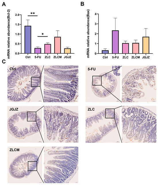 CFBs reduced 5-FU-induced apoptosis of intestinal cells. Ctrl: the control group; 5-FU: the model group; ZLC: pretreatment with ZLC; ZLCM: pretreatment with ZLCM; JGJZ: the positive control (pretreatment with JGJZ). (A) The mRNA expression levels of Bcl-2; (B) mRNA expression levels of Bax; (C) TUNEL staining (20× objective, scale bar = 50 μm). Data are presented as mean ± SEM, and differences were regarded as statistically significant at a p-value < 0.05 (* p < 0.05, or ** p < 0.01).