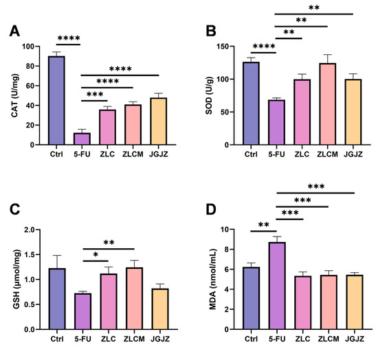 CFBs attenuated intestinal oxidative stress injury in mice induced by 5-FU. Ctrl: the control group; 5-FU: the model group; ZLC: pretreatment with ZLC; ZLCM: pretreatment with ZLCM; JGJZ: the positive control (pretreatment with JGJZ). (A) CAT; (B) SOD; (C) GSH; (D) MDA. Data are presented as mean ± SEM, and differences were regarded as statistically significant at a p-value < 0.05 (* p < 0.05, ** p < 0.01, *** p < 0.001, or **** p < 0.0001).
