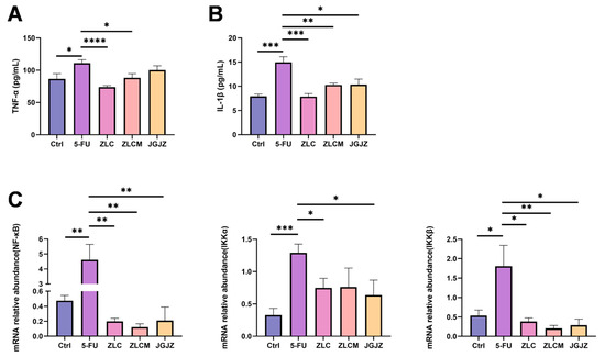 CFBs inhibited 5-FU-induced intestinal inflammatory response. Ctrl: the control group; 5-FU: the model group; ZLC: pretreatment with ZLC; ZLCM: pretreatment with ZLCM; JGJZ: the positive control (pretreatment with JGJZ). Contents of pro-inflammatory cytokines (A) TNF-α and (B) IL-1β; (C) mRNA expression levels of NF-κB, IKKα, and IKKβ. Data are presented as mean ± SEM, and differences were regarded as statistically significant at a p-value < 0.05 (* p < 0.05, ** p < 0.01, *** p < 0.001, or **** p < 0.0001).