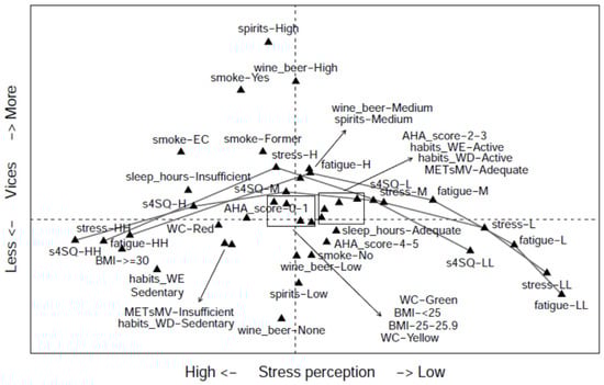 Multiple Correspondence Analysis map. The plot shows the modalities of the investigated variables (see the legend below) in the space spanned by the axes determined by MCA. The grey segments connect the modalities of the variables related to stress perception, namely s4SQ, stress, and fatigue. WC = waist circumference; AHA_Score = AHA nutrition score.; BMI = body mass index; METsMV = moderate and vigorous physical activity volume (adequate if ≥600 MET·min/week, otherwise insufficient); _WD = sedentary behaviour during working days (active if <9 h/week, otherwise sedentary); _WE = sedentary behaviour during weekends (active if <9 h/week, otherwise sedentary); sleep_hours = hours of sleep (adequate if ≥7 h/day, insufficient otherwise); stress: LL (low: 0–2), L (moderate/low: 3–4 points), M (moderate: 5–6 points), H (moderate/high = 7–8 points), HH (high: 9–10 points); fatigue: LL (low: 0–2), L (moderate/low: 3–4 points), M (moderate: 5–6 points), H (moderate/high = 7–8 points), HH (high: 9–10 points); s4SQ = short questionnaire on subjective somatic-stress-related symptoms: LL (low: 0–3 points), L (moderate/low: 4–6 points), M (moderate: 7–10 points), H (moderate/high: 11–15 points), HH (high: 16–30 points); smoke = smoking habits: SM (smoker), FSM (former smoker), EC (electronic cigarettes), and NS (non-smoker); Wine_beer = wine and beer consumption: none (0 glass/week), low, medium, high (0, 0.1–1, 1.1–2.9, and >2.9 glasses/week); spirits = spirit consumption: none (0 glasses/week), low (0.1–1 glasses/week), high (>1 glasses/week). The modalities of the variables of interest (e.g., smoker, non-smoker) are represented by points, and the presence of points close to one another reveals that the corresponding modalities are tendentially observed together. On the right side of the plot (X-axis), the following variables are found: fatigue = LL (very low), L (moderate/low), and M (moderate); stress = LL (very low), L (moderate/low), and M (moderate); and s4SQ = LL (very low) and L (moderate/low). Higher levels of the same variables are observed in the left part. Note that the different classes for perceptions of stress, fatigue, and somatic symptoms are in progressive order, as evidenced, respectively, by the lines. In the top part of the figure (Y-axis) and near each other, the following variables are found: smokers (also smokers of electronic cigarettes, represented by the label EC), former smokers, and the highest levels of wine and beer (represented by the label Wine_Beer-High) and spirit (Spirits-High) consumption. The lowest levels of the same variables are observed in the bottom part.