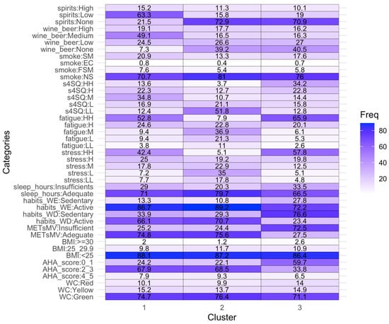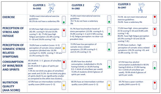 Subsequently, cluster analysis was performed. According to the average silhouette width, 5861 students were grouped into three clusters (Figure S2). Each cluster corresponds to a distinct lifestyle pattern. Figure 2 shows the characterization of clusters in terms of student’s features, and the corresponding textual description is reported in Figure 3. It may be seen that the major degree of association among the variables of interest (which emerged from the MCA) is reflected in the clusters’ composition. Subjects in clusters 1 and 3 present high stress and fatigue perception, along with medium–high perceptions of somatic stress-related symptoms; subjects in cluster 2 report low perceptions of somatic-stress-related symptoms and low perceptions of stress. Similarly, wine/beer and spirit consumption are connected in each of the three clusters. In the clusters, we do not find an association between smoking habits and alcohol consumption; however, this is likely due to the low degree of association.