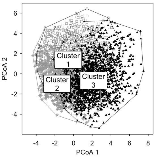 PCoA was performed to investigate the degree of separateness of the three clusters. Figure 4 depicts that the clusters show some degree of separateness, even though some overlapping occurs in the central part of the figure.