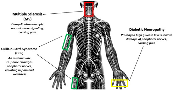 Neuropathic pain is a common symptom across various neurological conditions, including multiple sclerosis (MS), Guillain-Barré syndrome (GBS), and diabetic polyneuropathy [16]. In MS, pain arises from the demyelination of nerve fibers, disrupting normal sensory processing and leading to abnormal pain perception [38]. GBS, which involves peripheral nerve damage and inflammation, can also trigger neuropathic pain, often experienced as tingling, burning, or shooting sensations [1,16]. Diabetic polyneuropathy, a frequent complication of diabetes, is caused by nerve damage due to prolonged hyperglycemia, leading to debilitating pain that significantly impacts quality of life [39].