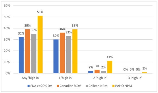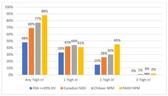 Understanding how the proposed FDA definition of “high-in” compares to established regional models is critical for informing future regulatory actions as well as understanding implications for the potential impact of the FOPL regulation in the US. The objective of this study was therefore to compare the proportion of products in the US food supply that would be considered “high-in” and thus receive an FOPL under the proposed US FDA approach to existing regional NPMs, including a modified version of Canada’s NPM for FOPLs, Chile’s NPM, and the PAHO NPM. Due to the Mexico and Brazil models being heavily based on other existing NPMs, these were not examined in analysis.