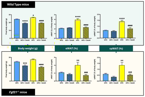 The final body weight and the weight percentages of visceral adipose tissue depots (eWAT and rpWAT) are presented in Figure 1. SAAR-fed mice showed a significant reduction in body weight compared to their respective controls (NFD and HFD groups) after 5 weeks of intervention, in both WT and Fgf21−/− mice. HFD significantly increased body weight in WT, but not in Fgf21−/− mice. Regarding visceral adiposity, SAAR counteracted the HFD-induced increase in eWAT and rpWAT in both genotypes.
