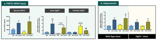 SAAR modulated the expression levels of the cardioprotective hormones FGF21 and Adiponectin. Serum FGF21 levels were quantified using an ELISA kit (n = 4–6 animals per group). mRNA expression levels were quantified via RT-PCR (n = 7–11 animals per group). Statistical analysis was performed using one-way ANOVA followed by Tukey–Kramer post-hoc multiple comparison tests. Significance levels to the NFD group are denoted by the * symbol: * p < 0.05, ** p < 0.01, **** p < 0.0001. Significance levels to the HFD group are denoted by the # symbol: # p < 0.05 and ## p < 0.01.