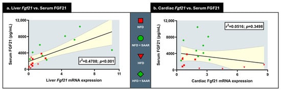 Compared to NFD, exposure to HFD did not change serum FGF21 levels or liver Fgf21 mRNA expression in WT animals (Figure 2a). In contrast, SAAR elevated both serum FGF21 concentrations and liver Fgf21 mRNA expression, while abrogating the HFD-induced increase in cardiac Fgf21 mRNA expression (Figure 2a). A significant positive relationship (r2 = 0.471; p < 0.001) was identified between liver Fgf21 mRNA expression and serum FGF21 levels (Figure 3a), suggesting that liver Fgf21 mRNA expression levels are associated with higher serum FGF21 concentrations. In contrast, there was no significant relationship between cardiac Fgf21 mRNA expression and serum FGF21 concentrations (r2 = 0.052; p = 0.3498) (Figure 3b). Regarding adiponectin expression, SAAR increased cardiac Adipoq mRNA expression in a genotype-independent manner (Figure 2b).