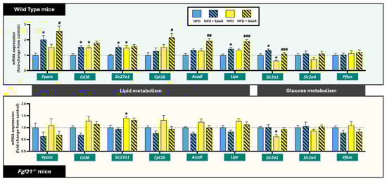 SAAR enhanced the expression of cardiac lipid utilization genes and Slc2a1 in WT mice but not in Fgf21−/− mice. mRNA expression levels were quantified via RT-PCR (n = 6–11 animals per group). Statistical analysis was performed using one-way ANOVA followed by Tukey–Kramer post-hoc multiple comparison tests. Significance levels to the NFD group are denoted by the * symbol: * p < 0.05. Significance levels to the HFD group are denoted by the # symbol: # p < 0.05, ## p < 0.01 and ### p < 0.001.