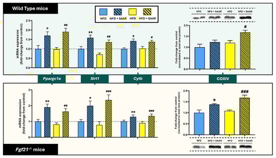 SAAR modulated the expression of genes related to mitochondrial biogenesis across both genotypes in the heart. mRNA expression levels were quantified via RT-PCR (n = 7–11 animals per group). Protein quantification was conducted using Western blot (n = 6–11 animals per group). Statistical analysis was performed using one-way ANOVA followed by Tukey–Kramer post-hoc multiple comparison tests. Significance levels to the NFD group are denoted by the * symbol: * p < 0.05 and ** p < 0.01. Significance levels to the HFD group are denoted by the # symbol: # p < 0.05, ## p < 0.01 and ### p < 0.001.
