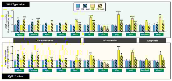 SAAR significantly increased the gene expression of Nfe2l2, a key transcription factor involved in the regulation of the antioxidant response, and the antioxidant enzymes Cat and Gpx1 in both WT and Fgf21−/− mice (Figure 6). In addition, SAAR significantly abrogated the HFD-induced decrease in mRNA expression of the antioxidant enzyme Sod2 in Fgf21−/− mice only. In contrast, SAAR abrogated the HFD-induced increase in Nox2 mRNA expression, involved in the production of ROS, across both genotypes (Figure 6).